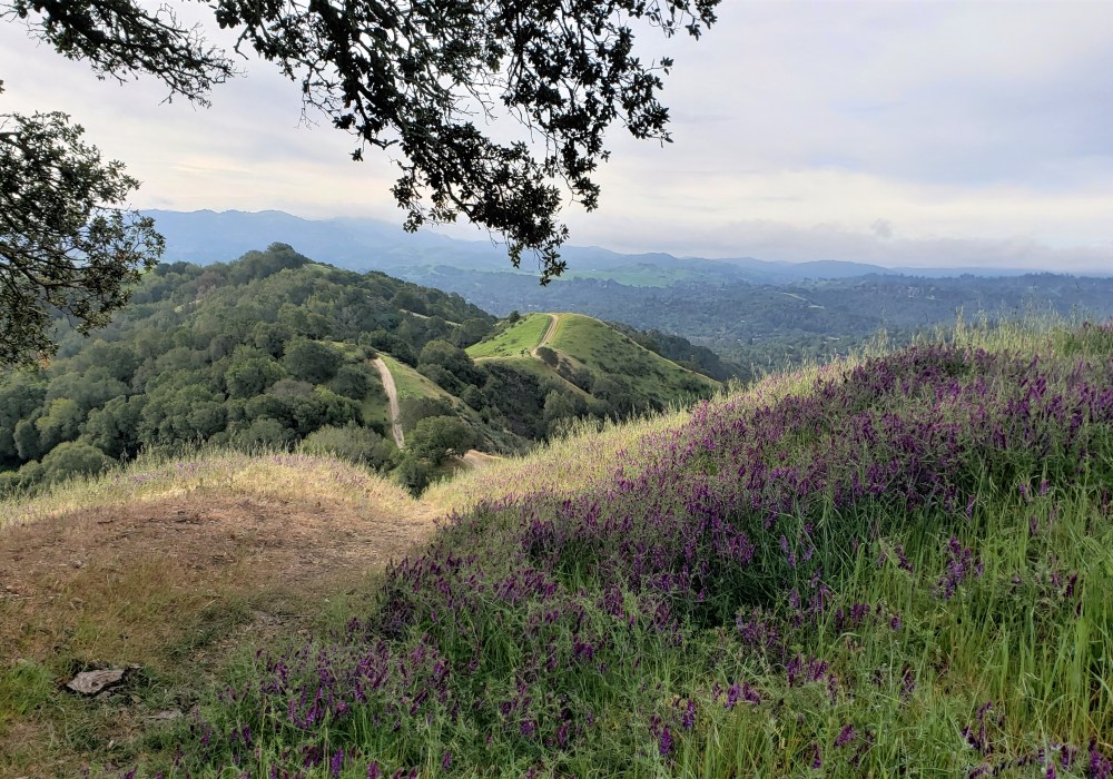 At mile 41, we entered Las Trampas: our final set of big hills. After a mile or so on the Virgil Williams trail, we hit the big climb up Del Amigo. This and Sulphur Springs would take us to Las Trampas Ridge, the first of the park’s two big ridges. This was hard climbing, but the wildflowers lifted our spirits.