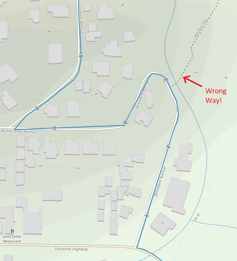 From Cardiac, the course follows the Dipsea to Stinson Beach, where a few blocks of road running lead to the dreaded Willow Camp fire road (dreaded because it climbs 1800′ in two miles). The road stretch is maybe the least interesting part of the course, but this year it proved surprisingly troublesome. From Highway 1, runners are supposed to turn right on Belvedere and continue around the bend onto Buena Vista. They are NOT supposed to go up the Matt Davis trail, which has a trailhead on the north side of Belvedere. I was therefore surprised when I found that trailhead marked with two orange ribbons, one on either side. This clearly pointed runners up Matt Davis.