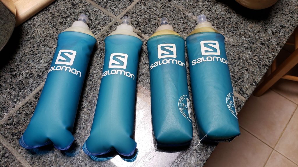 The last time I ran this race, I relied mainly on smoothies for fuel. That often works well, as it’s an easy way to get both calories and fluid. Unfortunately, that day was rainy and cold–not great for chugging down mango juice. So this year I tried something new: potato puree. Boiled potatoes are one of my race staples: they provide complex carbs, are high in potassium, and when salted also provide sodium. The only catch is that I sometimes have trouble eating them during a long race, particularly if it’s hot. By boiling and pureeing them, I hoped to combine the starchiness and saltiness of potatoes with the drinkability of a smoothie. It seemed worth a try. I cooked four large russet potatoes and one Japanese sweet potato, and blended them with salt to roughly the consistency of a running gel. I was able to fit them all into four large flasks: