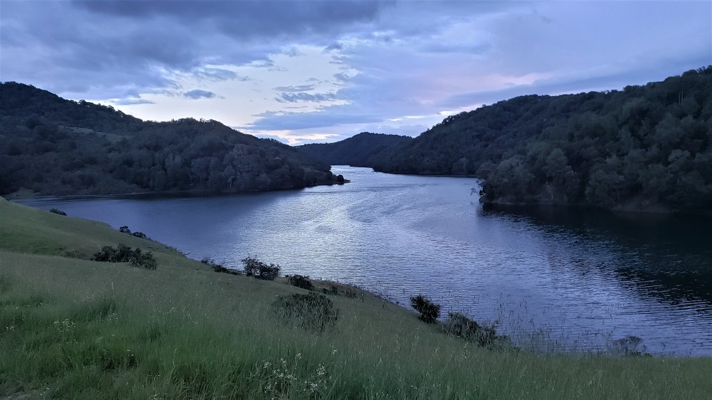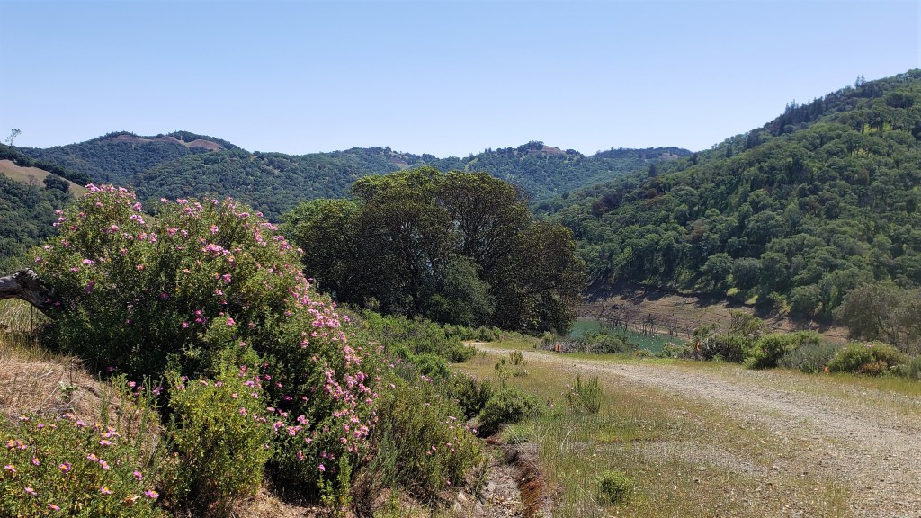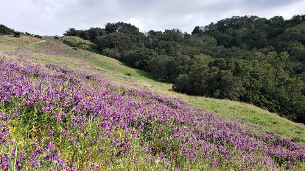 Our first leg took us through Briones, which was hilly and green. The views from Table Top trail were spectacular: Mt Diablo in the distance and wildflowers everywhere. We came across a lone newt. California newts were ubiquitous here only seven or eight years ago, but our ongoing megadrought–the worst in at least 1,200 years–has taken a severe toll. Nice to see a few still hanging on.