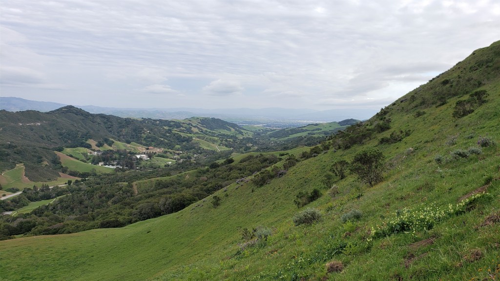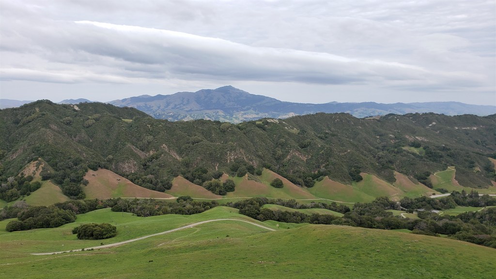 From Las Trampas Ridge, we descended to the Bollinger Canyon staging area, then began the climb to Rocky Ridge: our last big climb! This was also hard, but made easier by knowing we were almost done. The top of Rocky Ridge was cold and windy, but we still took a moment to savor the views. Diablo had receded into the distance, much as it had been that morning, and we discussed how monuments like that lend perspective to these long runs: a sense of where you’re going and where you’ve been.