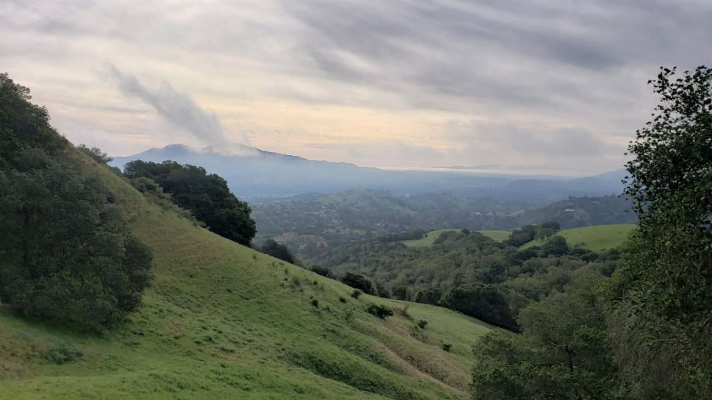 Since this was a point-to-point run, we needed two cars. We met at the finish–the Valle Vista staging area in Moraga–at 6:30am, then took my car to the start: the Mt Wanda trailhead in Martinez. We were off and running by 7:15. Although we expected rain, the forecast said it wouldn’t start until evening, so we hoped to finish before the rain arrived. That morning was cloudy, but it was nice to see the sun peeking under the clouds.