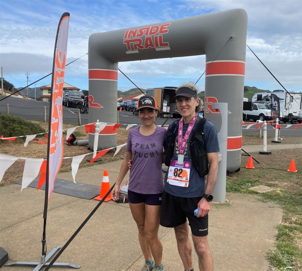 I really like the last five miles of this course: runnable single-track that winds up, down and around rolling green hills. I kept on pushing, no longer worried about being caught, but wanting to finish strong. I saw Megan again at Laguna Seca, only a few hundred yards from the finish. She ran most of that distance with me; I crossed the finish line and was done. When Luis finished seven minutes later, I gave him a fist bump and thanked him for pushing me. I meant it: I owed my strong finish to him. As for Alex, he’d finished 34 minutes ahead of me and had already left.