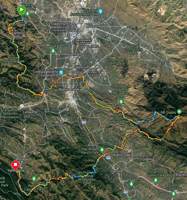 The route passes through my three favorite East Bay parks: Briones, Mt Diablo, and Las Trampas. Although I’ve done a lot of running in all three, I’ve never tried to connect them. Fortunately, doing so is easy thanks to the Briones-to-Mt Diablo and Las Trampas-to-Mt Diablo regional trails. Those connectors were terra incognita to me, so I was looking forward to checking them out.