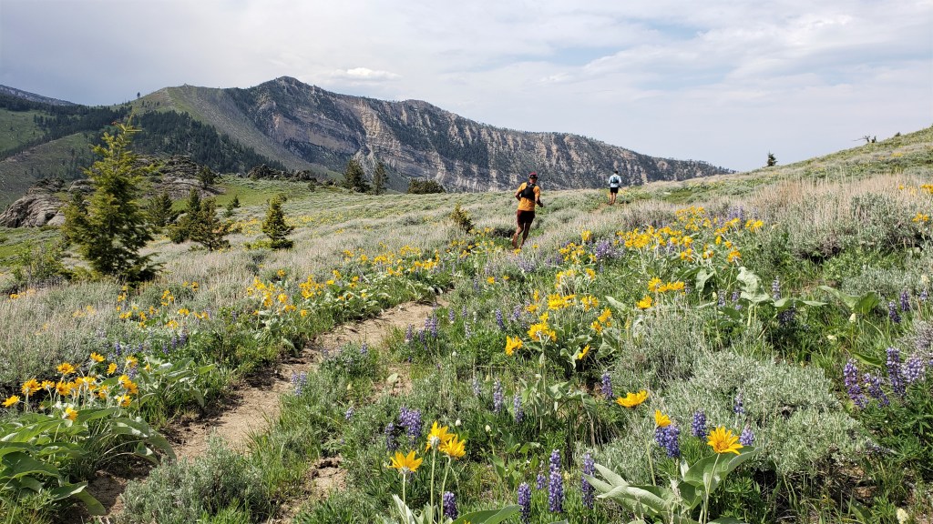 I returned to the Richmond aid station, then headed east toward Richmond Pass. We’d received an email the day before, with an attached GPX, saying that this year’s race would include the restored historic Richmond Trail. I’m glad it did, because this section was gorgeous. Both the climb to Richmond Pass and the descent down the other side had fantastic views and riotous wildflowers. (Note: the new course is slightly shorter but also steeper and more technical, so probably a wash in terms of time.)