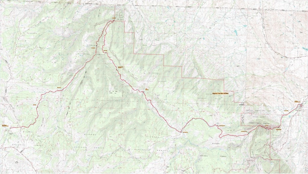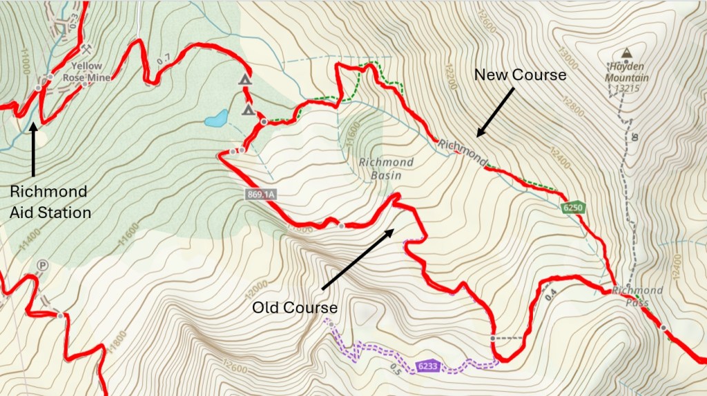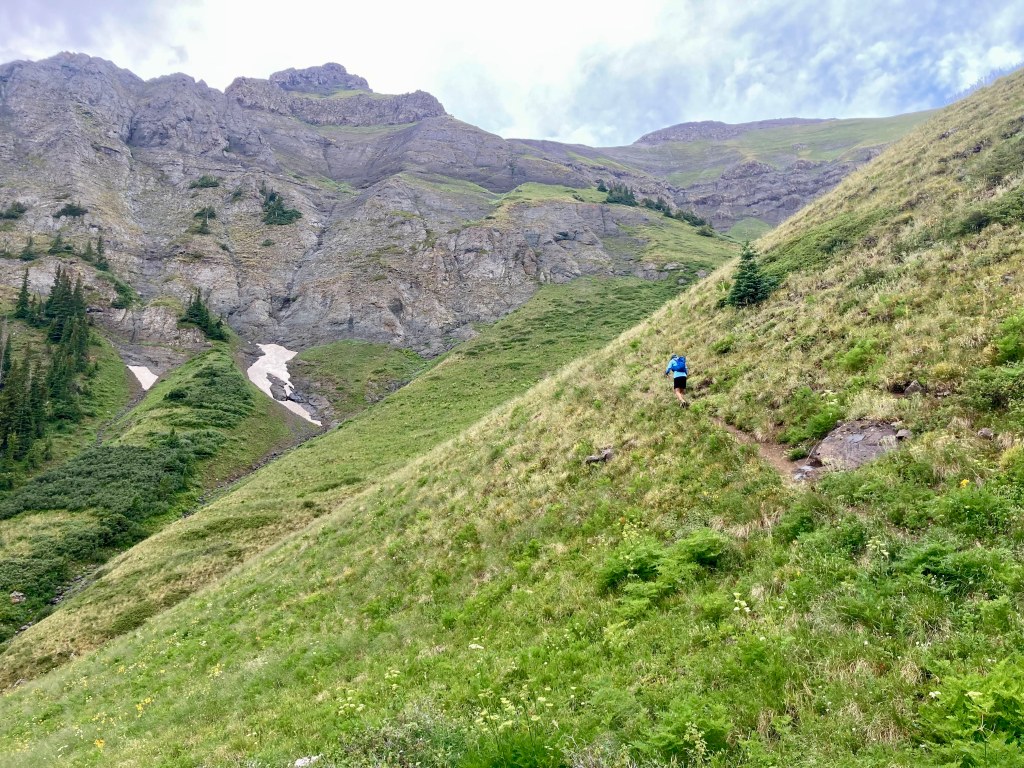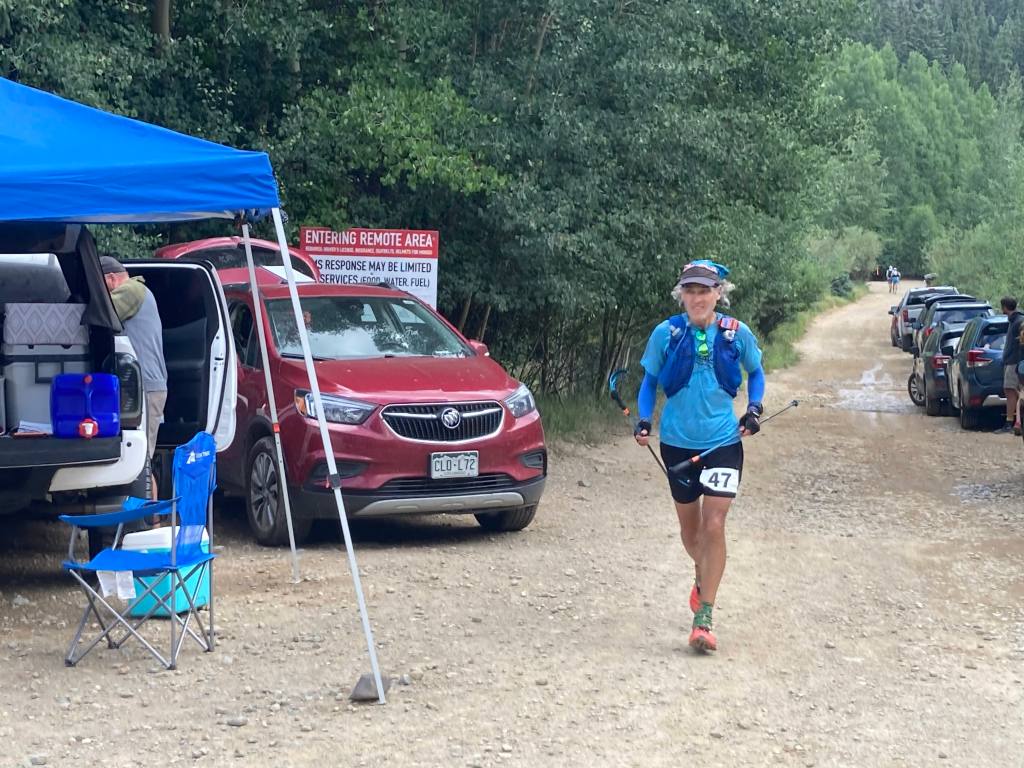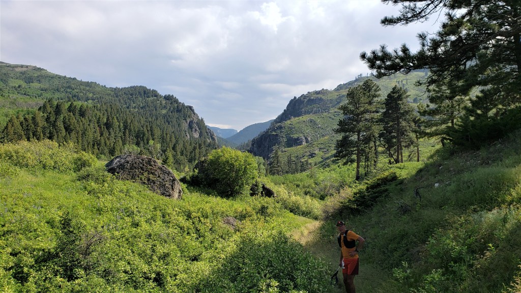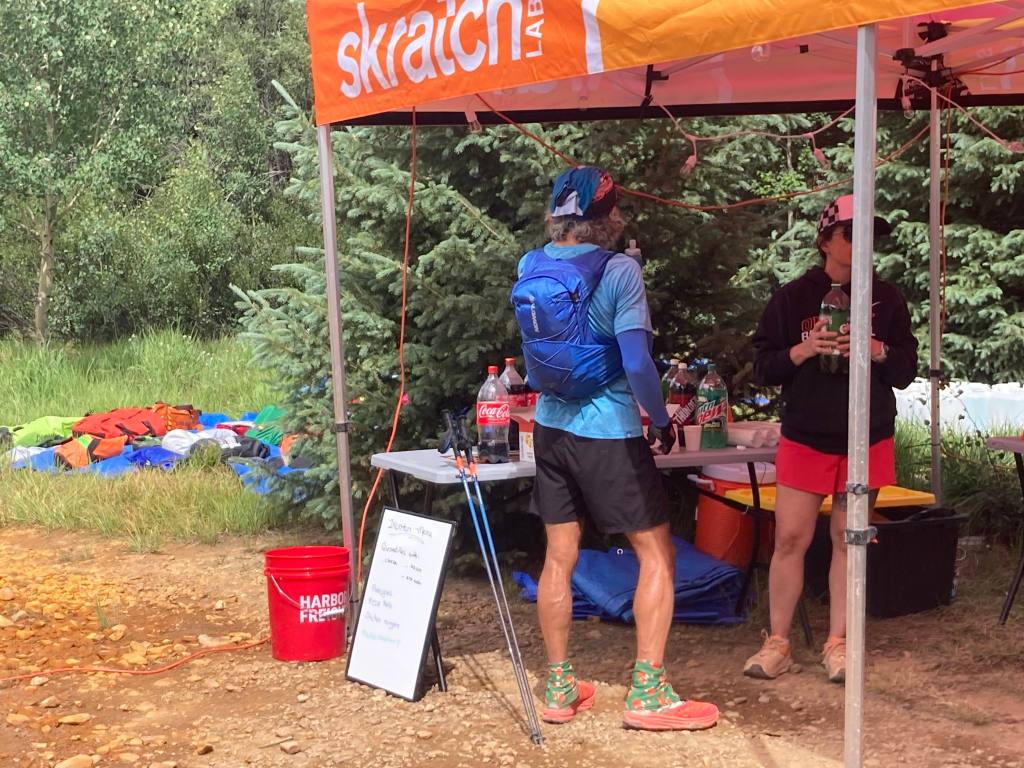 This was also the slowest part of the race so far. I’d maintained my 3.5 mph average to Fort Peabody and was comfortably above it by Richmond 2. But the climb to the pass was steep, technical and often overgrown, and I fell behind my target pace for the first time. The descent helped, but less than I’d hoped, as much of it was too steep to move fast. By the time I hit Highway 550 and ran the short flat stretch to Ironton, I was back on target pace, but barely.