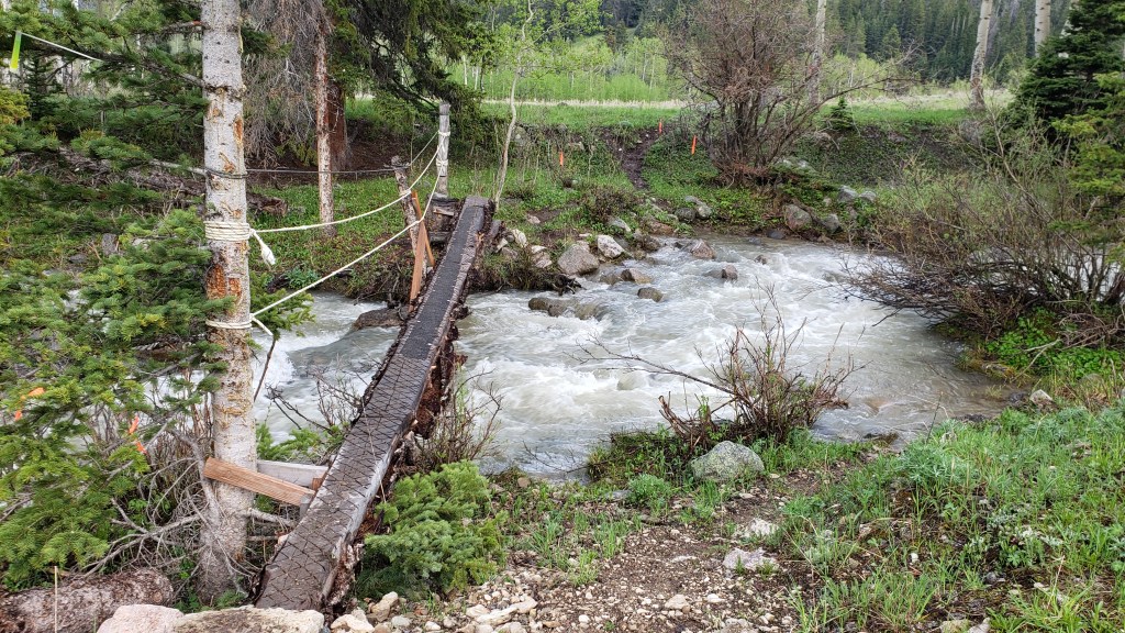 The first six miles were straightforward and familiar to me from Hardrock: a short single-track took you through a stone tunnel and over a gorge-spanning bridge, then spit you out on Camp Bird Road, which climbed gradually toward the Lower Camp Bird aid station. From there we took a right fork that led to the first turnaround at Silver Basin. This out-and-back was forgettable–mostly jeep road through dense woods–but opened up into a nice meadow with an alpine lake at the top. I followed the trail to the hole punch at the turnaround, punched my bib, and headed back down.