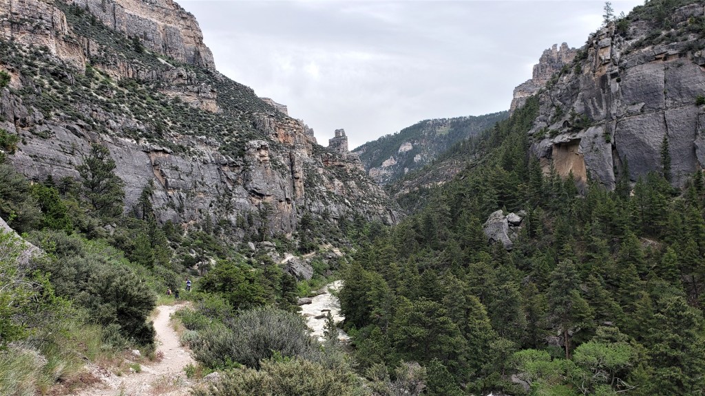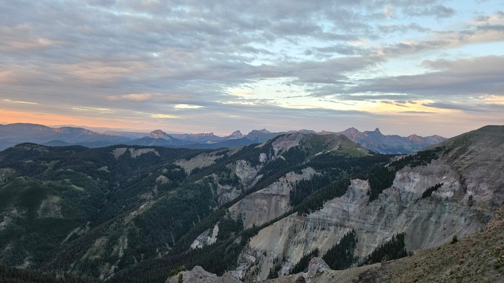 The climb up Hayden Pass wasn’t too bad, although I had to stop and sit down once. I wasn’t dying; just feeling weak. The single-track snaked through innumerable switchbacks, and it was a relief to finally break through the treeline and emerge onto an open ridge. It was light now, but I wasn’t paying much attention to my surroundings: just keep moving forward. The trail rolled along the ridge for a while, then began to descend–steeply. My immediate thought was “we’ll have to climb this again.” Every step of this super-steep descent filled me with dread.