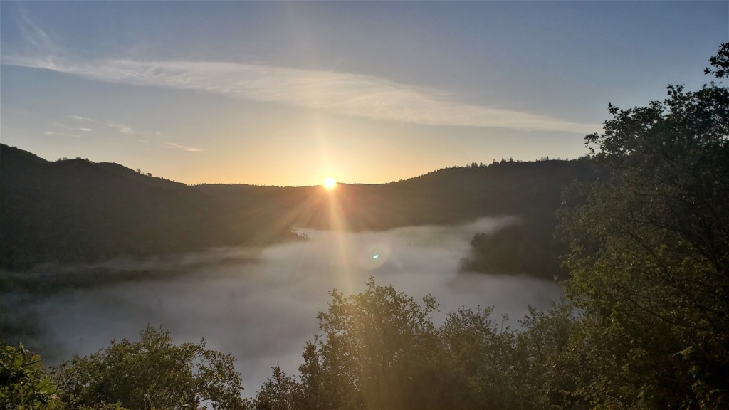 The early miles were uneventful: I jogged along slowly, not feeling great, but hoping my legs would eventually warm up. My legs always feel crappy for the first few miles, so it would take at least that long to assess how well I’d recovered. In the meantime, I enjoyed the early morning sights: a full moon over the American River, canyons filled with fog, and eventually a nice sunrise.