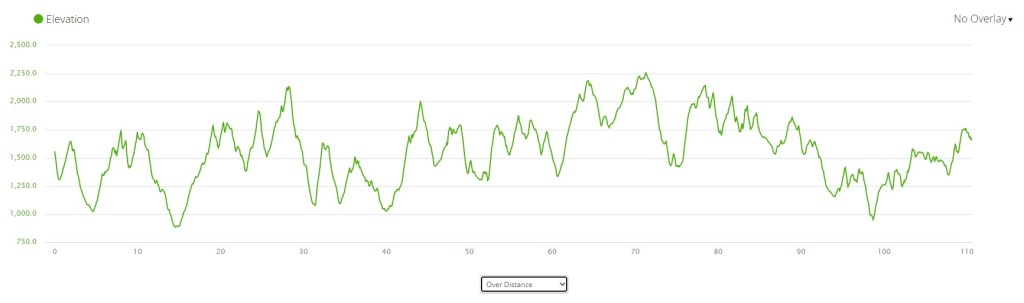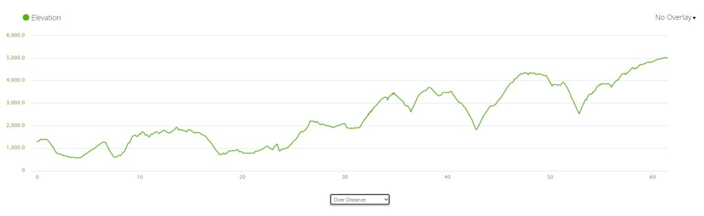 I’ve now done Ordnance four times: in 2015, 2018, 2020, and 2022. It’s a small, low-key race, but one of my favorites. The course begins at the Laguna Seca racetrack just east of Monterey, and makes its way around Fort Ord National Monument. It’s surprisingly diverse: you get sand dunes, oak forests, hillsides covered with chaparral, and open foothills with expansive views. This year’s course was different from previous ones: due to permitting issues, the RD eliminated a long stretch of bike path and rerouted the course along a ridgeline. This added 1.5 miles and 1500′ of elevation gain, for 62.5 miles and 8,800′. Not what you’d call a lot of vert, but enough to keep things interesting. If you look closely at the elevation chart, you’ll notice that miles 21 to 40 look exactly the same as miles 43 to 62. That’s because the lower, southeastern loop is repeated twice.