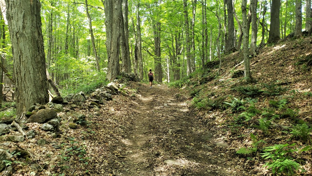I headed down the fire road toward Weehawken. I was glad to be heading that way, both for the gradual downhill and the prospect of seeing Megan. The downhill helped less than I’d hoped, as it was very rocky, but I was doing better than a runner I passed who’d apparently lost his downhill legs. Eventually the road smoothed out, and I made good time from Lower Camp Bird on.