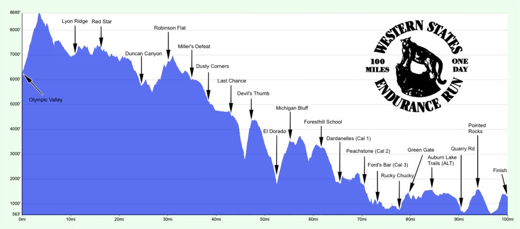 Canyons is also a pretty tough course, with around 15,000′ elevation gain in 100K. It starts in Auburn, in the Sierra foothills, and finishes in the mountains at China Wall, for a net elevation gain of almost 4000′. In between, it descends into and climbs out of the American River canyons multiple times. Both the descents and the ascents are steep and grueling: the downhills in particular take a toll on the legs. Last year’s race left my legs feeling trashed for two weeks. I’d trained more this year, however, so I hoped my legs would hold up better.