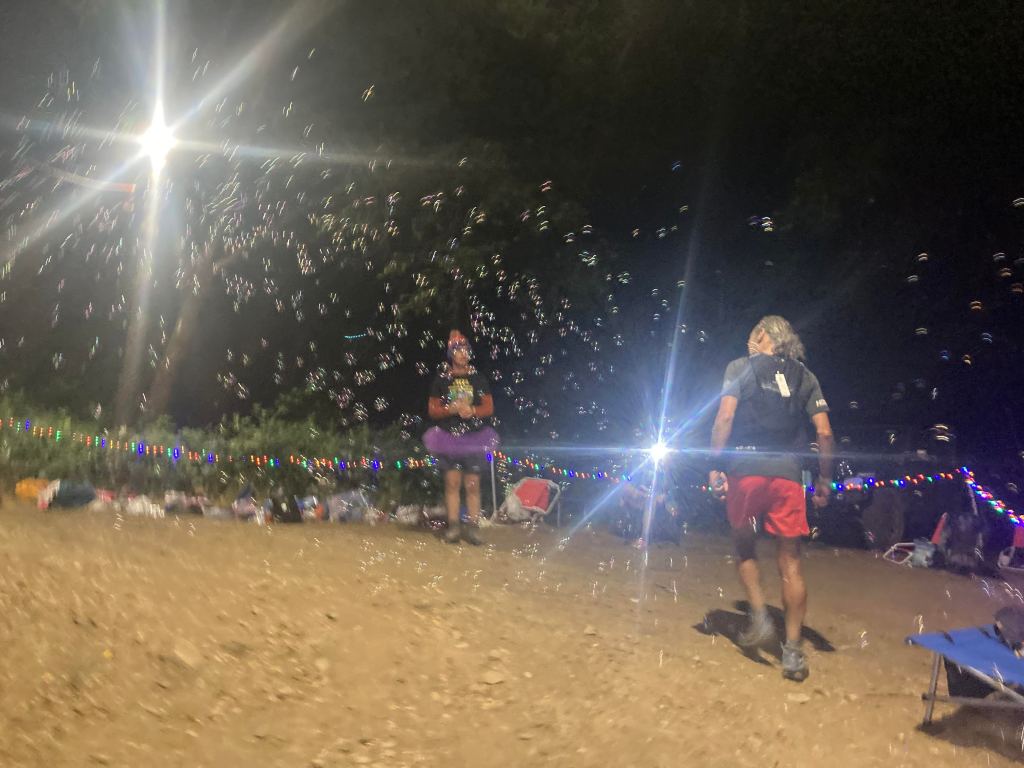 When we reached the Crystal Lake aid station, Megan insisted that I sit down for a while and eat. I plunked myself into a chair for the first time all race. The volunteers were cooking bacon and eggs but didn’t have great veggie/vegan options. They did, however, give me some ramen noodles in veggie broth (which took a while to soften) and mixed up some instant mashed potatoes. Neither was amazing, but I got the half-softened noodles down and mixed the broth with the mashed potatoes. Best nutrition I’d had in some time.