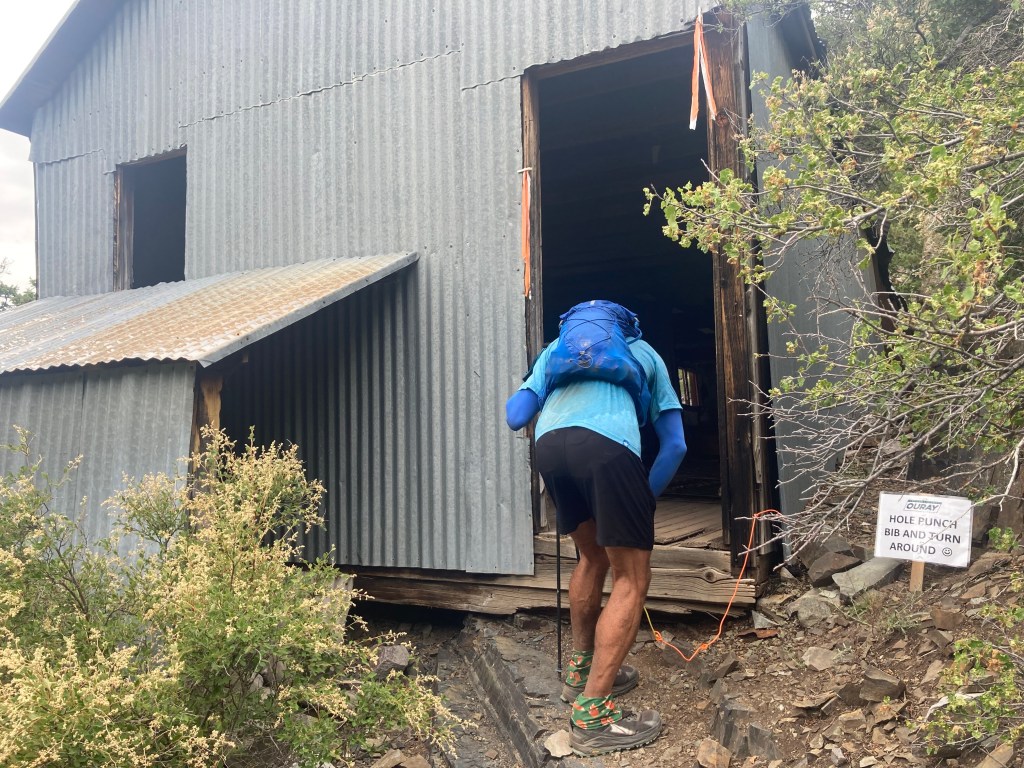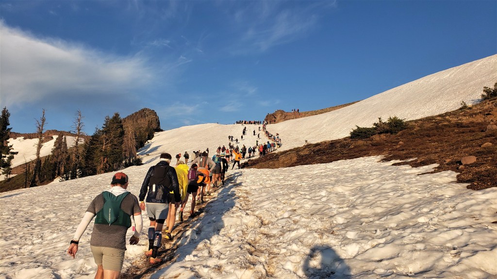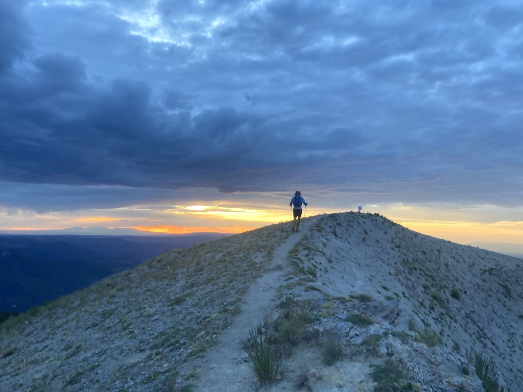 The aid station volunteers asked how I was doing, and I replied that Richmond Pass was hard. They said that seemed to be the consensus. I topped off my flasks, drank a little veggie broth, and tightened my shoes to stop my feet from slipping forward. I was starting to think the Olympuses were a mistake, as I’d been jamming my toes all the way down.