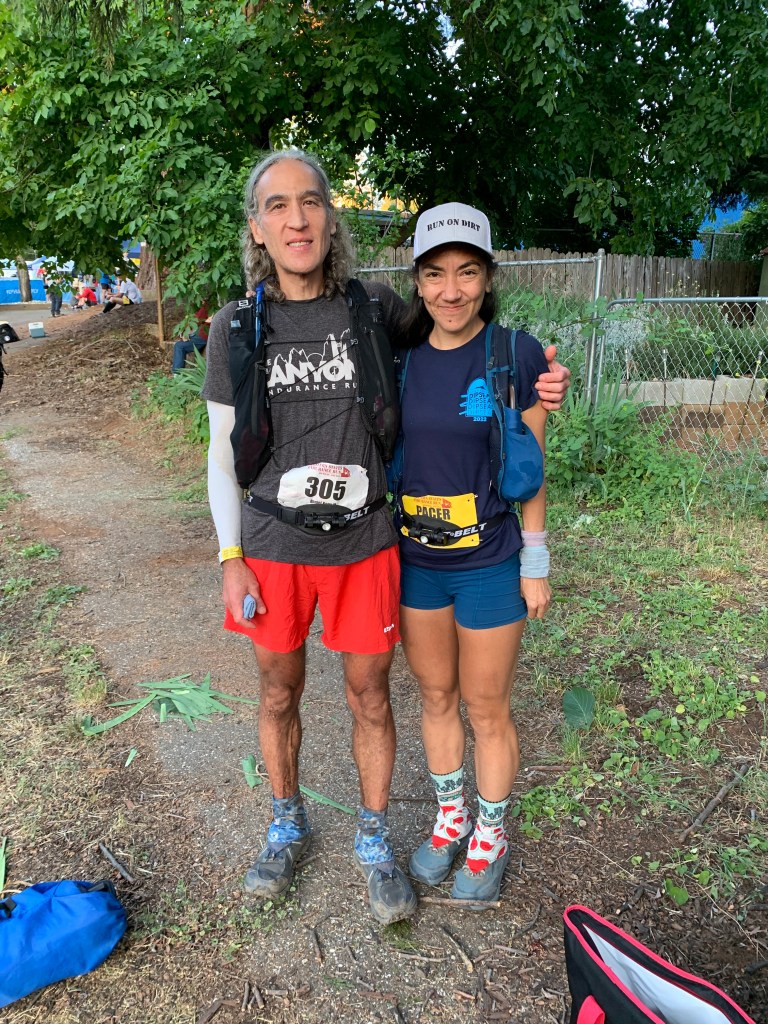 About three miles in, I caught up with Mark Tanaka, a regular at this race. I’d met Mark during this same race seven years earlier: it was my first 100K, and he coached me through it for fifty miles. This year we ran fewer miles together, but I enjoyed chatting with him about optimal pacing, health issues (Mark is an E.R. doctor), and conspiracy theories. However, a race is a race, and around mile seven I wished Mark a good race and picked up the pace.