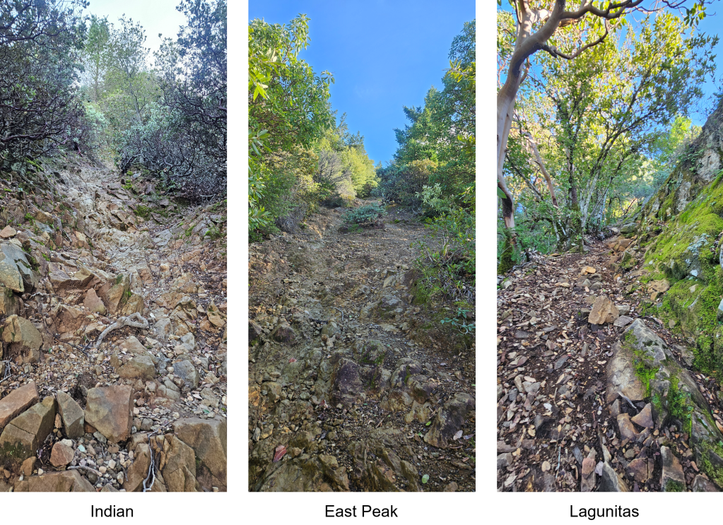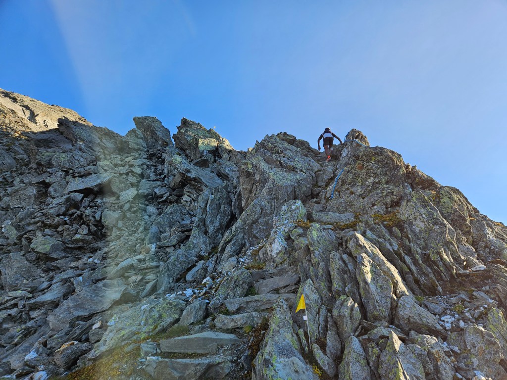 My 2024 route wasn’t really my choice: it’s just where everyone ahead of me went, and I mindlessly followed. This year Shane and I went that way again, on the grounds that it worked last time. As we learned, however, it worked last time because we had others to follow: this year, without such guidance, we wasted a lot of time finding the route and picking through rocks. Once we’d ascended a bit, I could see that AJ’s route made more sense: it stayed on a trail for longer, then climbed some easily traversable slabs before hitting talus. Our route choice here slowed us by 8 minutes relative to last year, and probably by more relative to this year’s other runners–who wisely chose to follow AJ’s route. If I do this again, I’ll do the same.