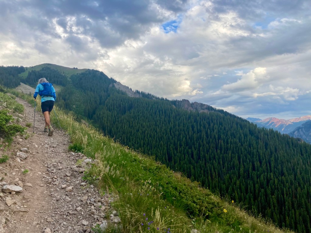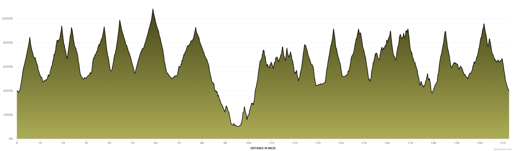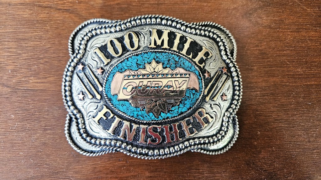 YouTuber Simon Guerard describes Ouray as Hardrock’s little brother–where “little” means younger, less established, and in need of validation. This is his explanation for Ouray’s absurd elevation gain. While Hardrock is legendary for its 33,197 feet of climbing, Ouray ups that ante by 26 percent, to 41,862 feet. That’s 410 feet of climbing per mile, for 102 miles. My hilliest prior ultras were the Tor des Geants (381 feet per mile), the Ben Nevis ultra (364 feet per mile), and the Swiss Peaks 100k (319 feet per mile). (Also the mostly off-trail Desolate Peaks–431 feet per mile–but that’s a different kind of beast.) Those are not easy races, but Ouray was something else. I hadn’t done any previous 100Ms with remotely this much vert, so I had no idea how long it would take. I set myself an A goal of 36 hours, a B goal of 38, a C goal of 40, and a D goal of “in time to make my flight.”
