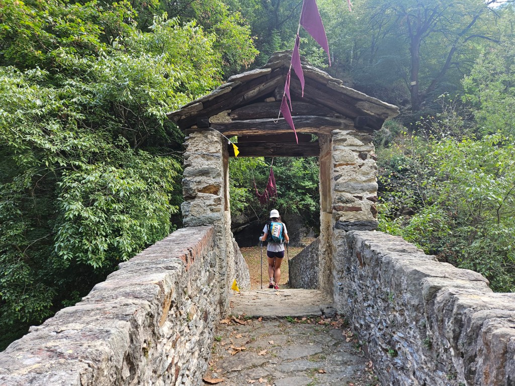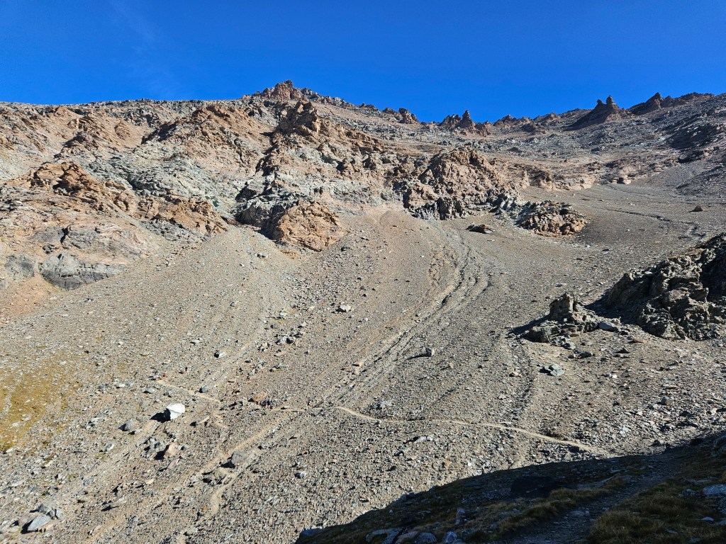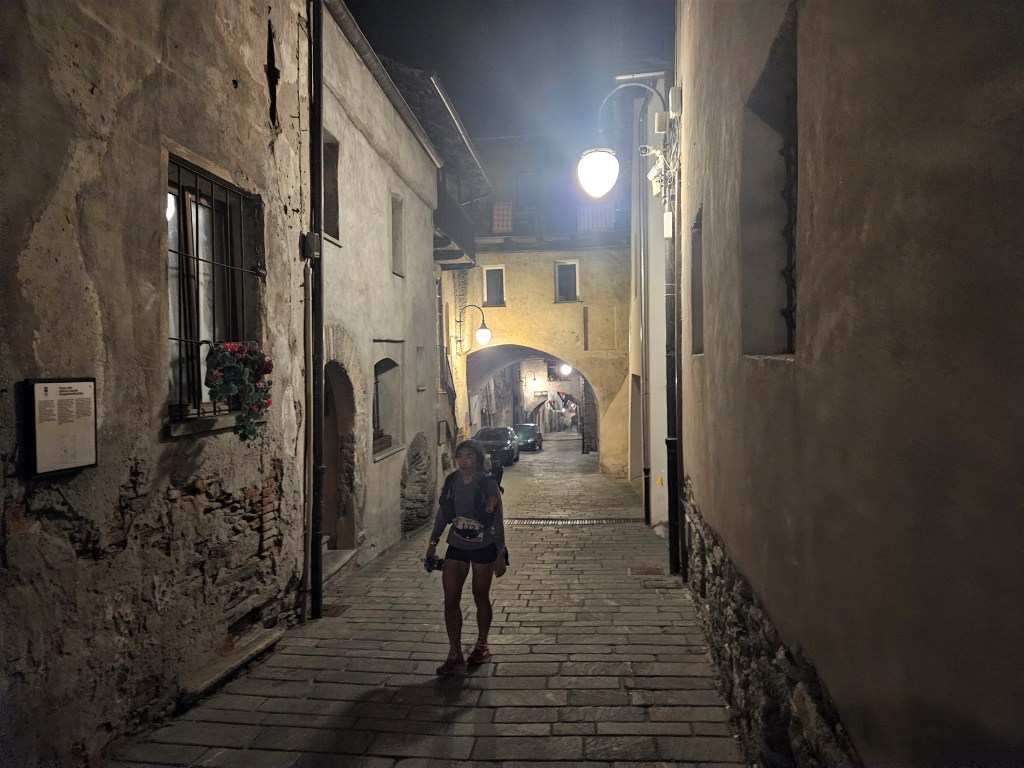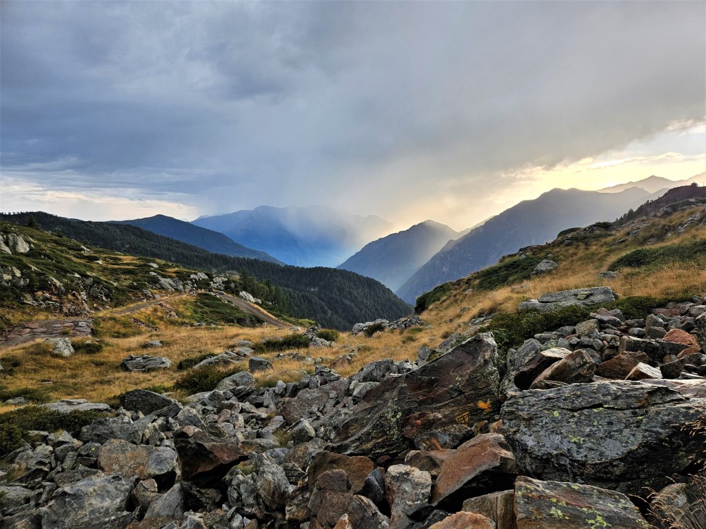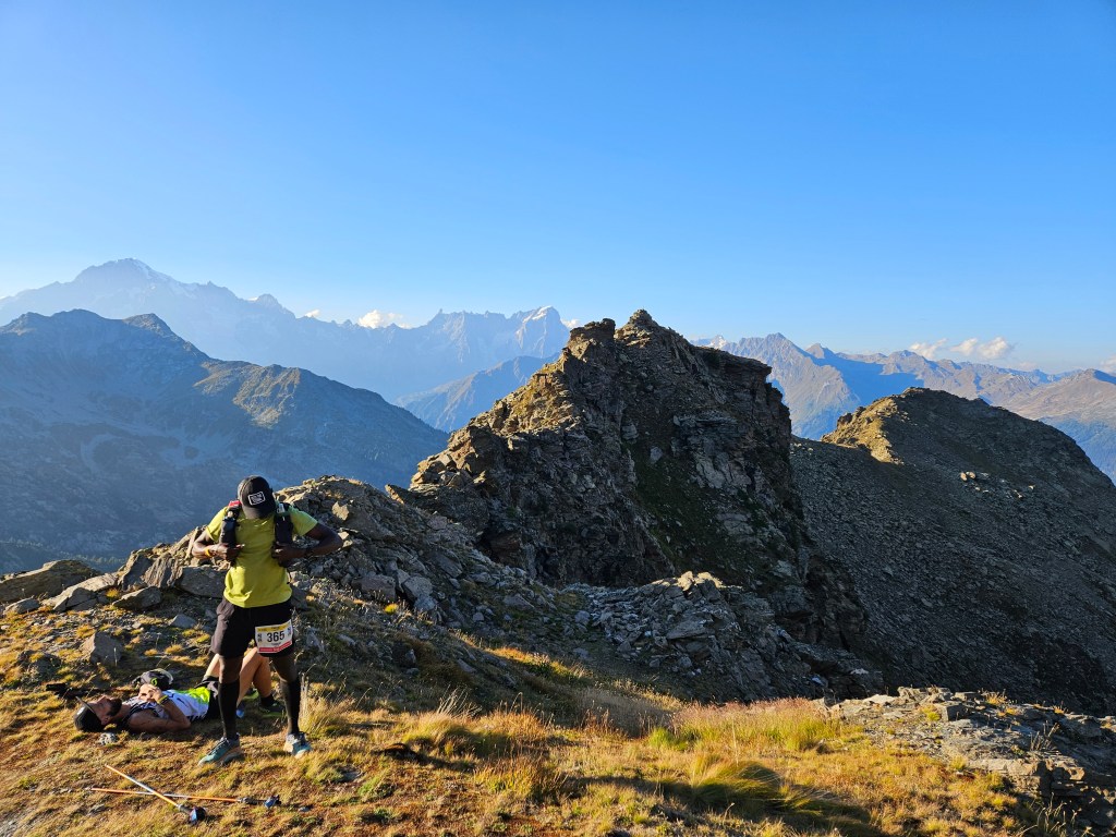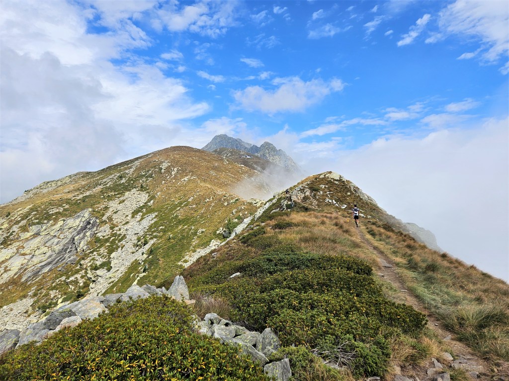 The descent was fun, as descents on fresh legs tend to be. I was, however, having issues with my pack. I’d decided I needed a larger pack for this year’s Tor des Geants, so I was trying out a Salomon Cross Season 15 instead of my usual Advanced Skin 12. I’ve mostly been happy with it, but I’ve noticed that some problems arise when it’s fully loaded (as it was now) and when I’m running as opposed to hiking. The right shoulder binds in ways that cause discomfort and chafing, and no amount of fiddling seems to fix this. I think the problem is that my body is asymmetric (right shoulder larger than left), and this pack’s water-resistant material doesn’t stretch to accommodate my asymmetries. The threat of chafing worried me, but there wasn’t much I could do right now, so I tried to ignore it.