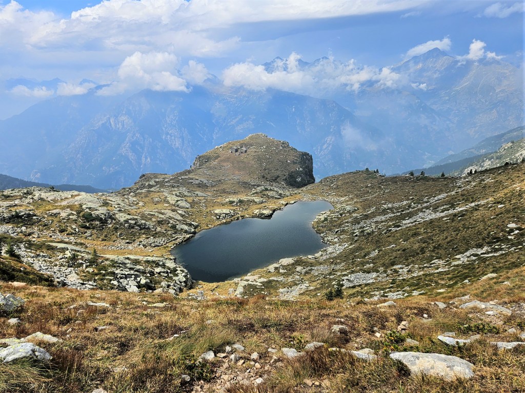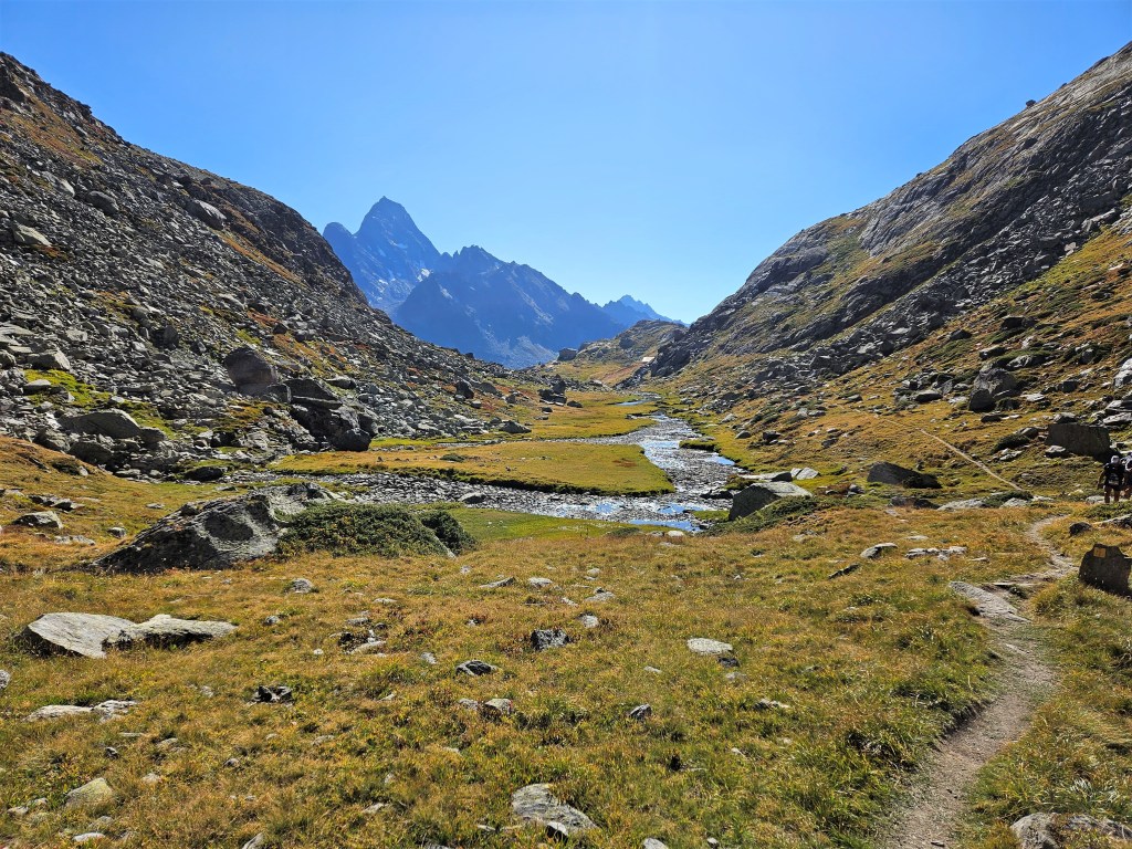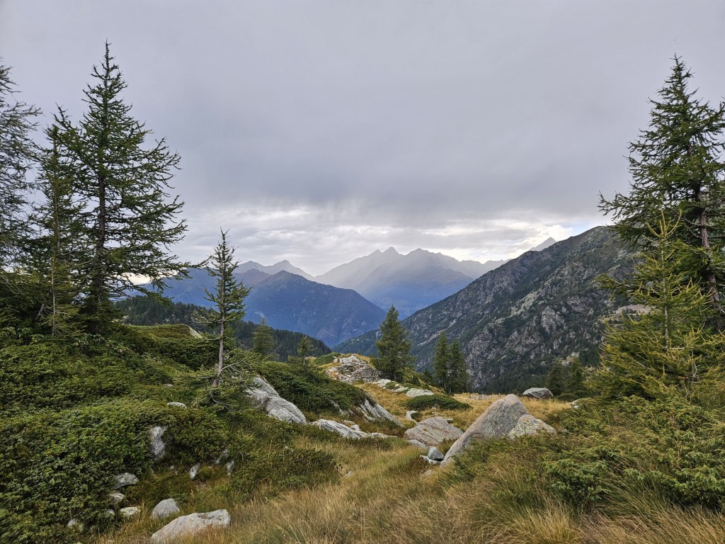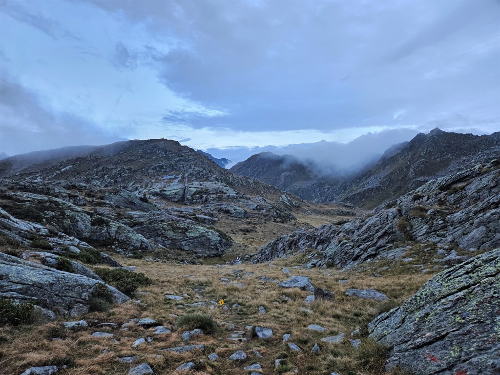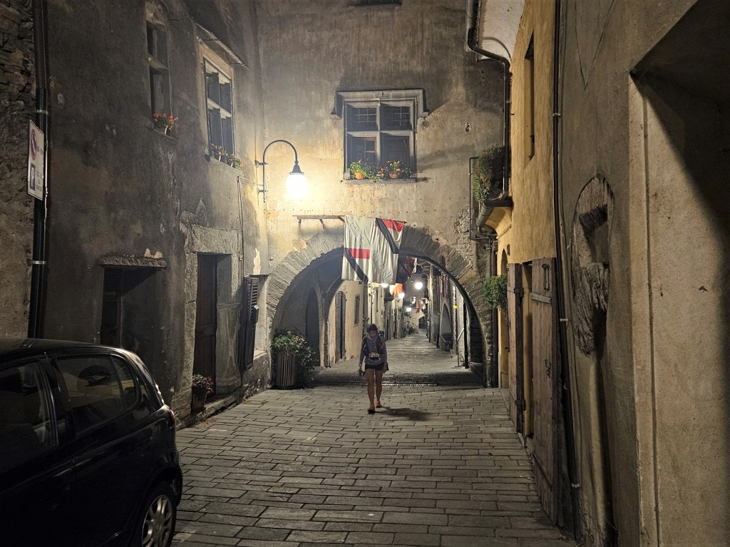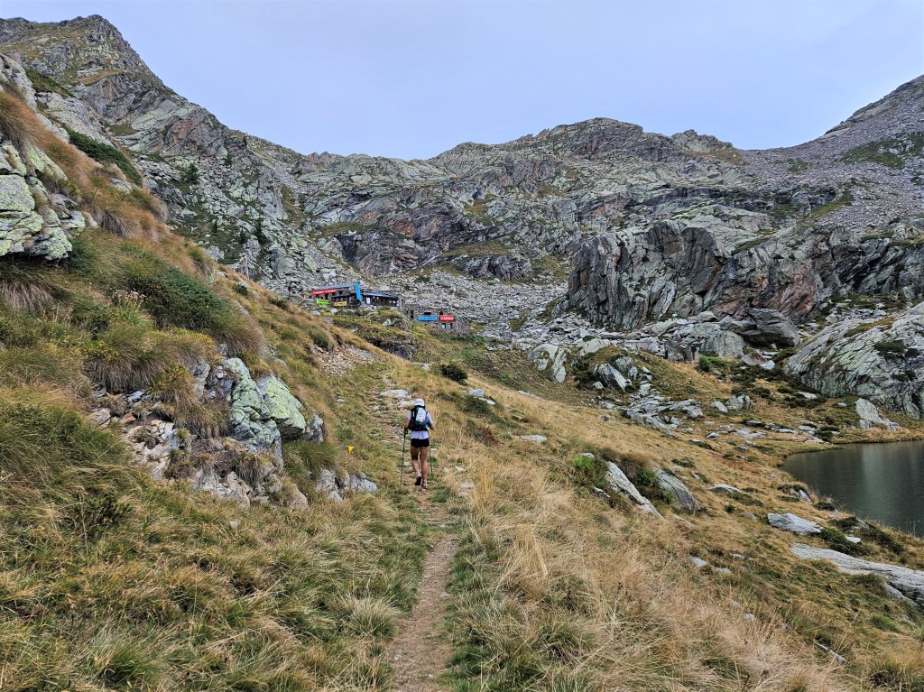 The descent was fun, as descents on fresh legs tend to be. I was, however, having issues with my pack. I’d decided I needed a larger pack for this year’s Tor des Geants, so I was trying out a Salomon Cross Season 15 instead of my usual Advanced Skin 12. I’ve mostly been happy with it, but I’ve noticed that some problems arise when it’s fully loaded (as it was now) and when I’m running as opposed to hiking. The right shoulder binds in ways that cause discomfort and chafing, and no amount of fiddling seems to fix this. I think the problem is that my body is asymmetric (right shoulder larger than left), and this pack’s water-resistant material doesn’t stretch to accommodate my asymmetries. The threat of chafing worried me, but there wasn’t much I could do right now, so I tried to ignore it.
