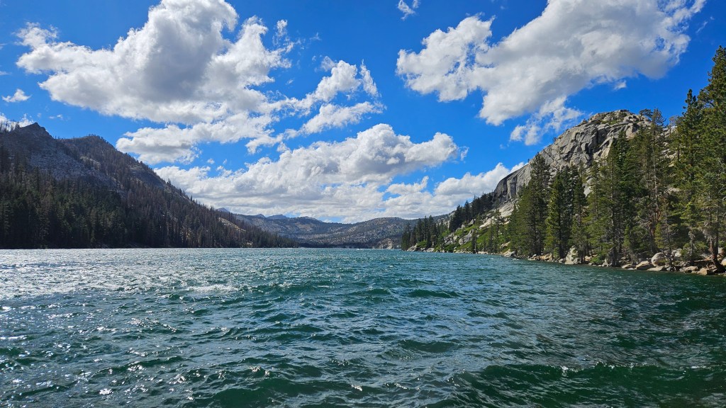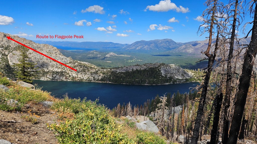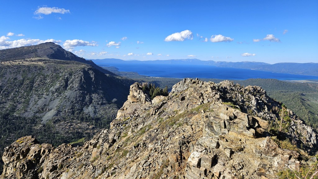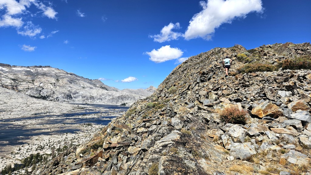 Last year I tried the western approach because it involved less descending, but I quickly discovered that it’s a steep, slidey mess. The eastern route is comparatively straightforward and got us to Angora pretty quickly. Matisse was taking a break there, and led the way down to Fallen Leaf.
