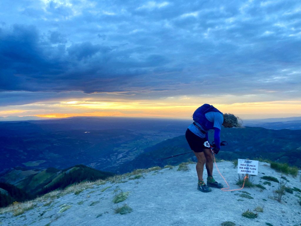 The blond ponytail guy who’d passed me on Richmond descended and said there was a beautiful crescent moon at the overlook. I reached it a few minutes later, and there was indeed a nice view of Ouray 3,000 feet below. I exchanged a few words with the runner who’d passed me going up, punched my bib, and headed down. He still couldn’t run downhill, so I quickly left him behind.