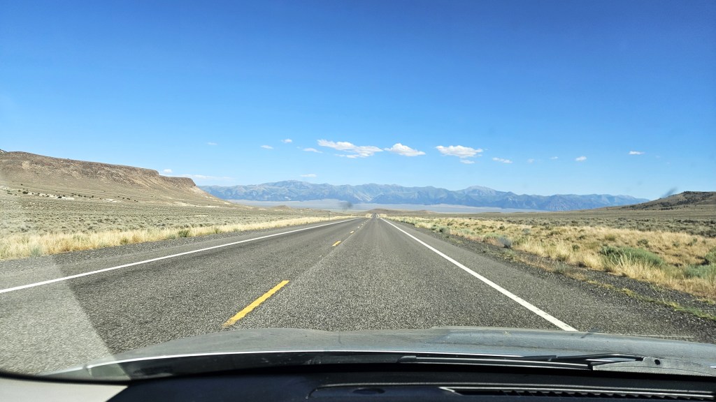 I left San Rafael on Saturday July 5, taking Highway 50–the “loneliest road in America”–through Nevada. I hadn’t been that way in years, but if you’re going to drive across Nevada, it’s the way to go. The highway is lonely but beautiful, passing through high desert and small towns like Austin, Eureka and Ely. I camped that night at Cave Lake State Park and did a short run there the following morning before moving on.